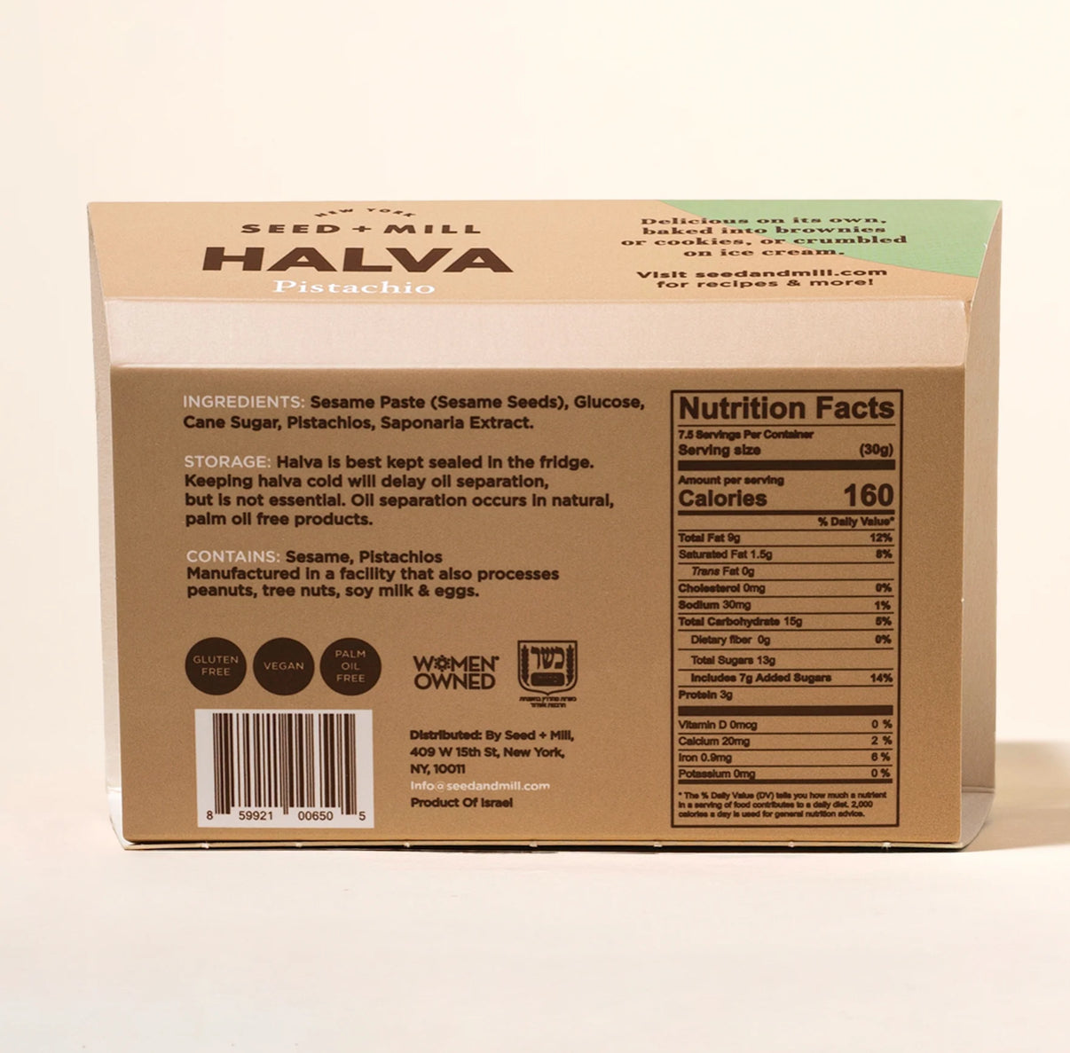 Seed and Mill halva is plant based, vegan, gluten free, kosher certified, palm oil free and all natural.